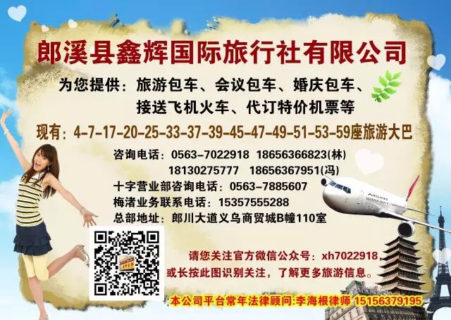 鑫辉国际旅行社地址:郎溪县义乌商贸城北门B幢110号 咨询热线:7022918、7022828 旅游值班电话:13731887951(微信同号) 旅游投诉电话:18130275777 营业时间:早上8:00—11:30 下午14:00—17:30