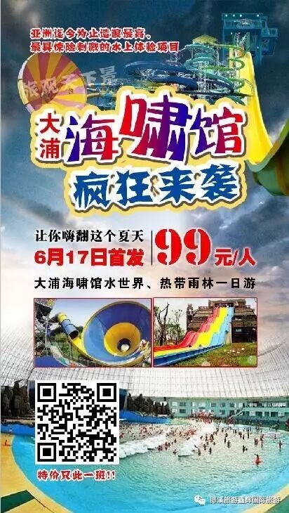 海啸馆首发班特价体验】大浦乡村世界、海啸馆一日游 发班日期:6月17日(首发班特价) 综合价格: 99元/人(大小同价) 景区介绍:大浦乡村世界位于芜湖市南陵县许镇镇东北部(205国道芜湖至南陵段20公里处)。总规划面积16平方公里。已获得“国家农业科技园区”、 “国家4A级旅游景区”、“国家现代农业示范区(核心区)”、“全国休闲旅游示范区”、“全国休闲农业与乡村旅游示范点”、“全国农产品加工示范基地”、“全国水产健康养殖示范基地”等多个国家级称号。 一、行程安排: 早6:30瀚海集合乘车前往中国首个低碳乡村旅游地、国家AAAA级景区——【南陵大浦乡村世界】(车程约1.5小时)。沿路参观包括大浦都市农园(高科技农业示范园)、热带科普植物园、葫芦神宫、南瓜探秘、浦天童乐、鸵鸟孔雀观赏园、薰衣草花圃等。 其中【海啸馆】是体验基地的主体内容之一,结合高科技声光电效果,运用国际第三代真空造浪技术,造成惊涛骇浪,能够逼真地再现“海啸”的汹涌澎湃,是最具惊险刺激的水上游乐项目。游客身临其境时,会伴随DJ节奏和模拟声效,迎接突如其来的超级猛狼; 下午16:00左右集合乘车返回郎溪,结束愉快旅程! 二、服务标准: 1、交通:全程空调旅游车(根据人数安排车型) 2、门票:大浦景区首道门票(含海啸馆); 3、用餐:自理(园区内有餐厅,可由导游代为安排,团队餐标准25元/人) 4、导服:全程导游服务(园区内客人自由活动); 5、保险:已按国家规定投保旅行社责任险;并建议自行购买旅游人身意外险! 更多精彩线路,详询